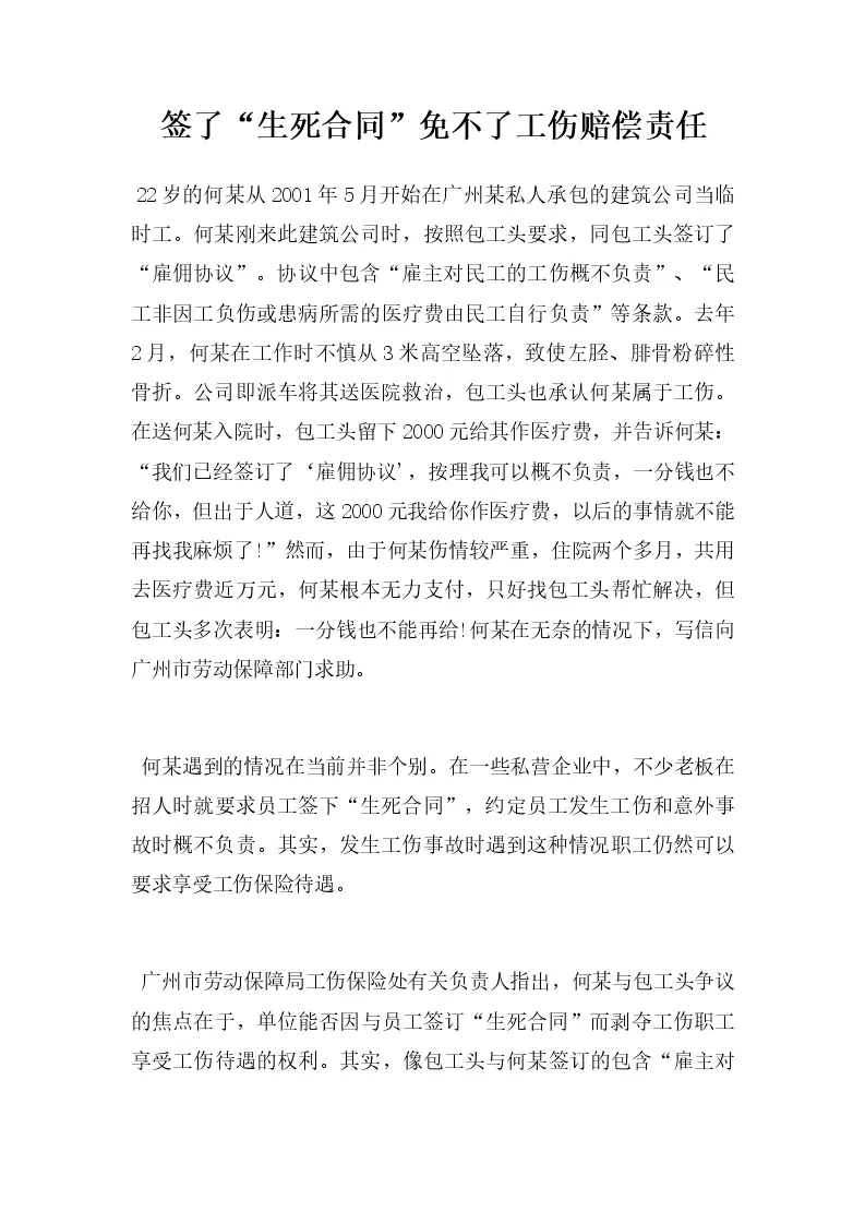签了“生死合同”免不了工伤赔偿责任