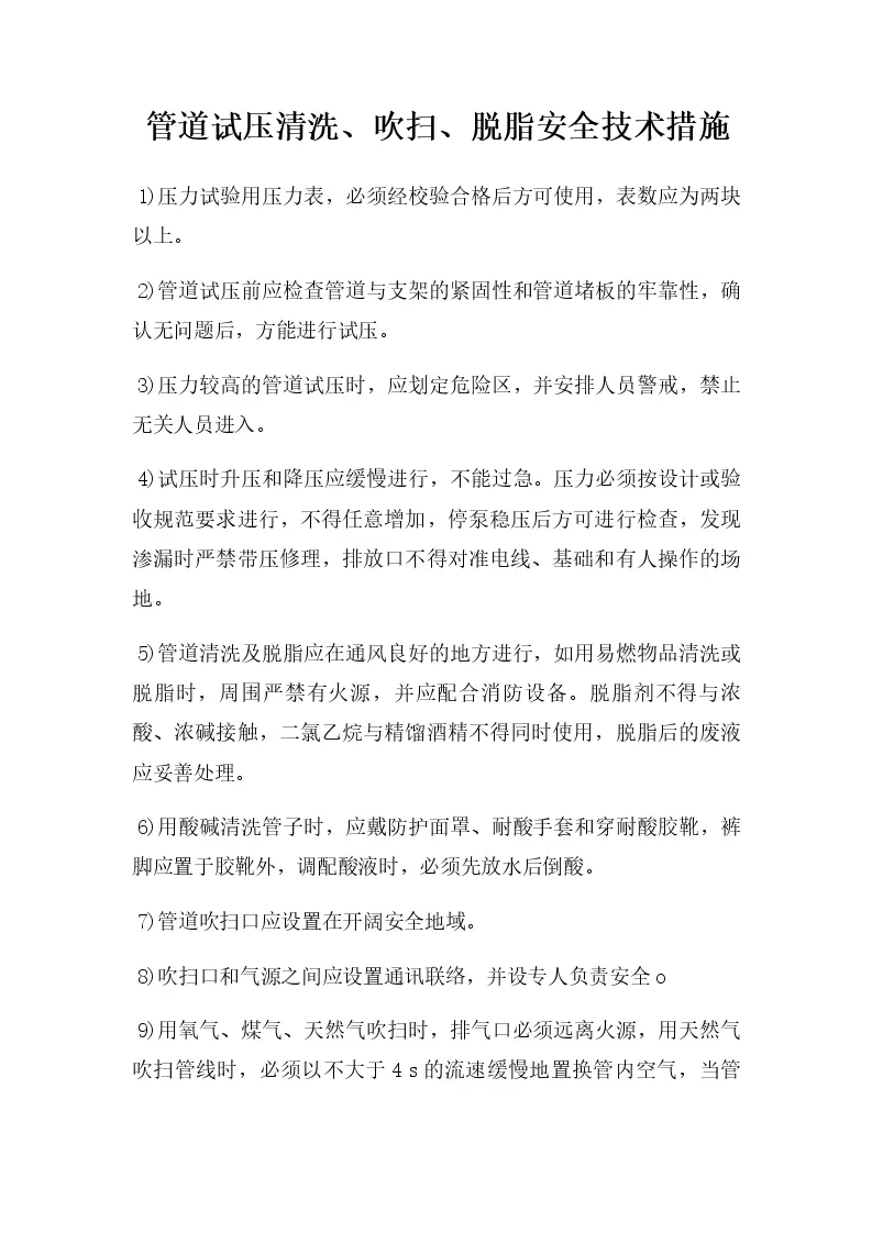 管道试压清洗、吹扫、脱脂安全技术措施