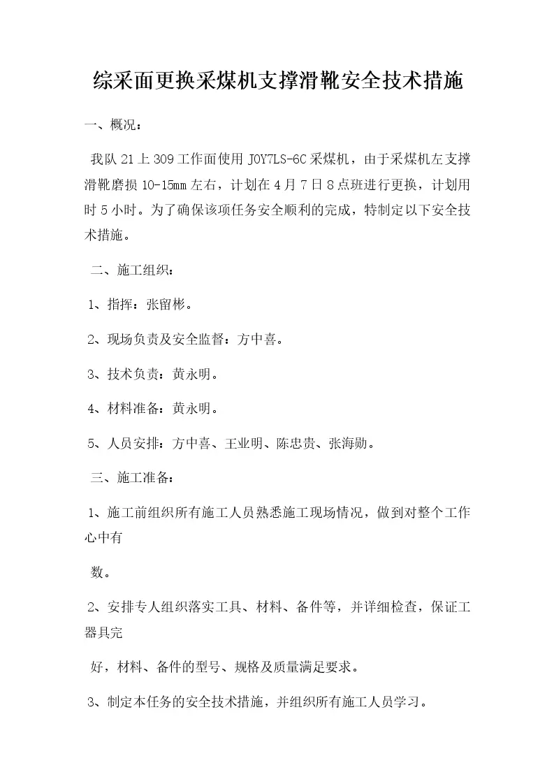 综采面更换采煤机支撑滑靴安全技术措施