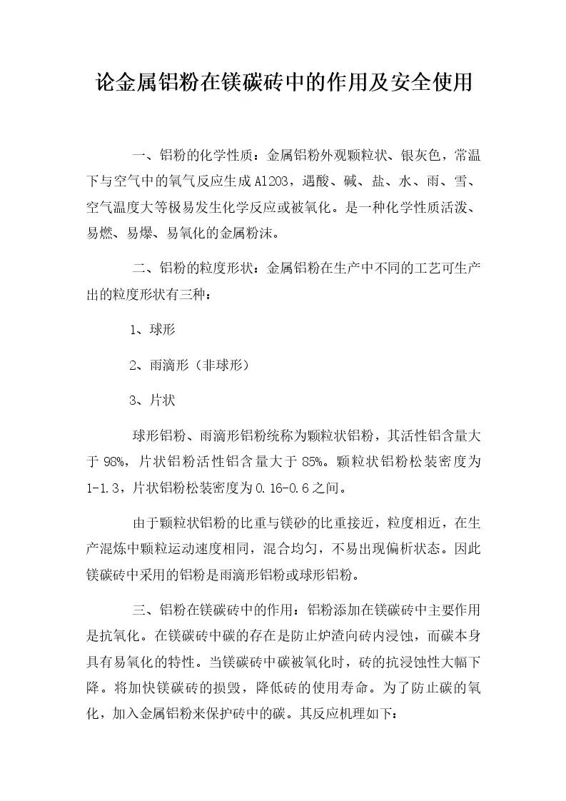 论金属铝粉在镁碳砖中的作用及安全使用